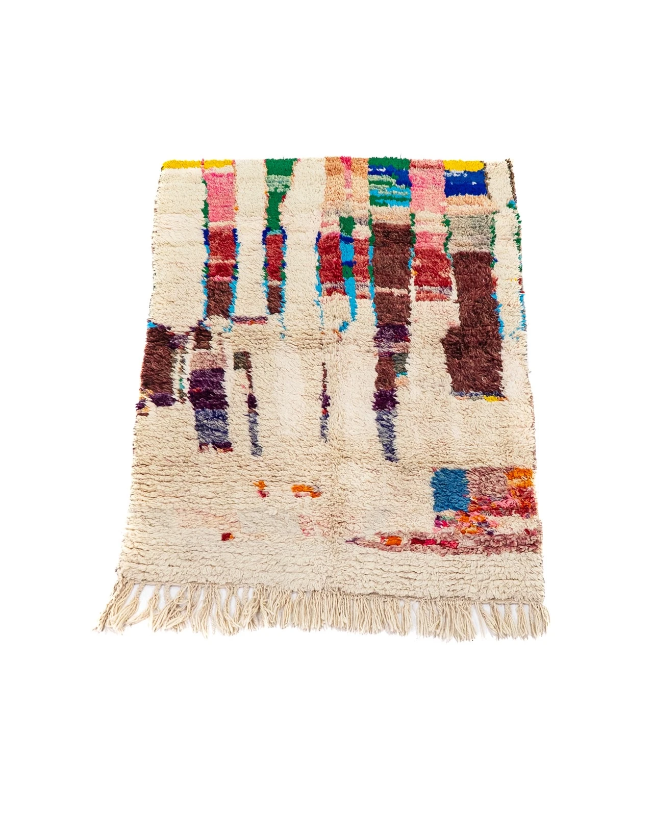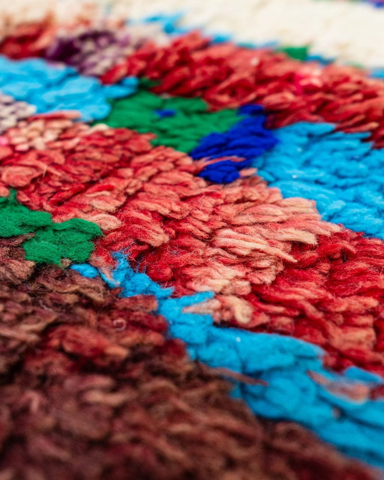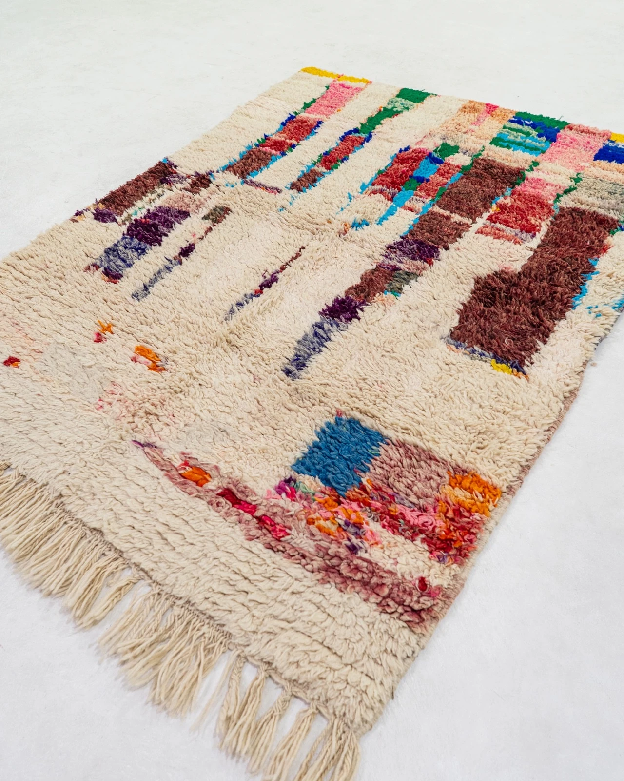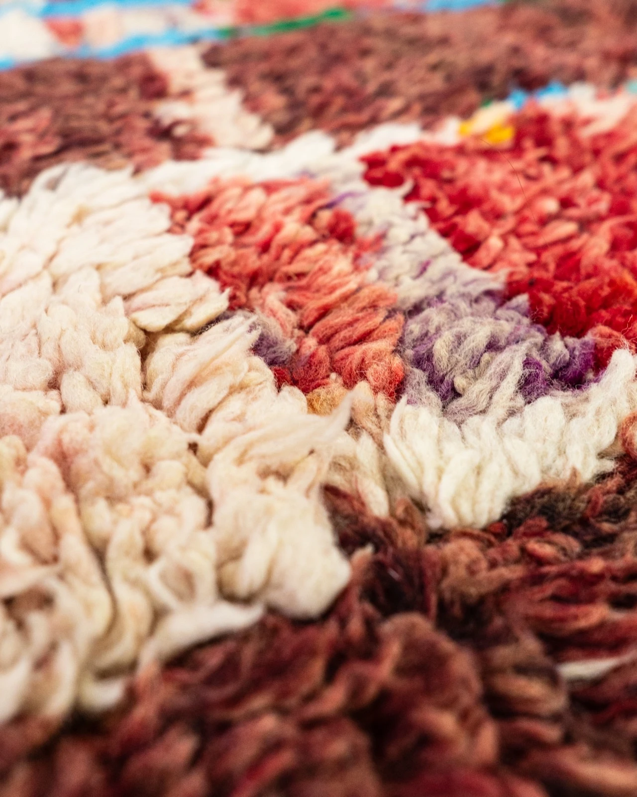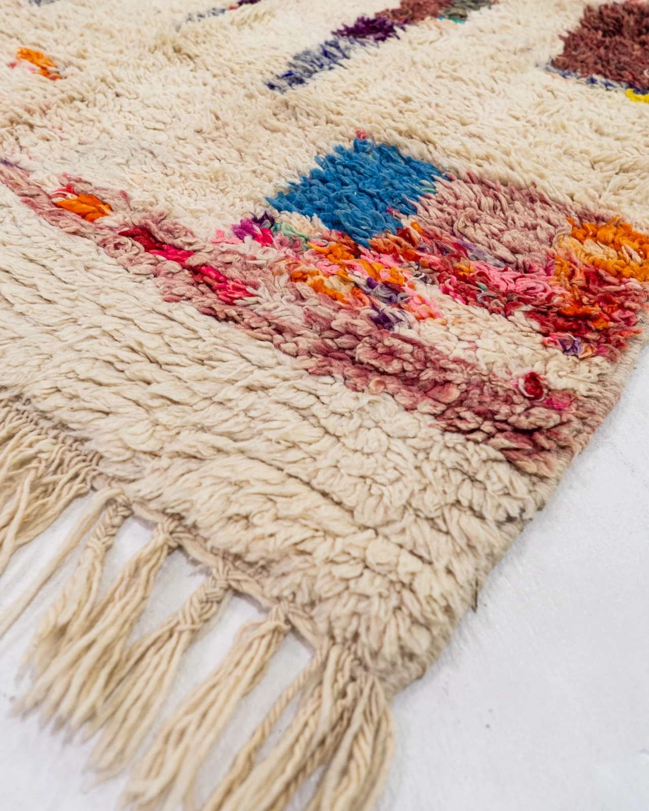 Alfombra bereber tejida a mano con lana gruesa, patrones espontáneos y estética bohemia del norte de África.