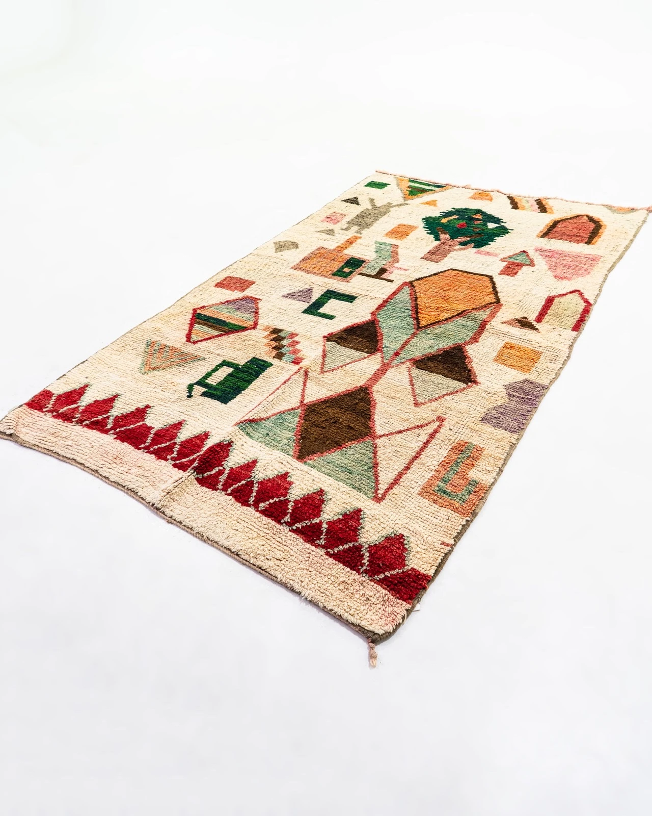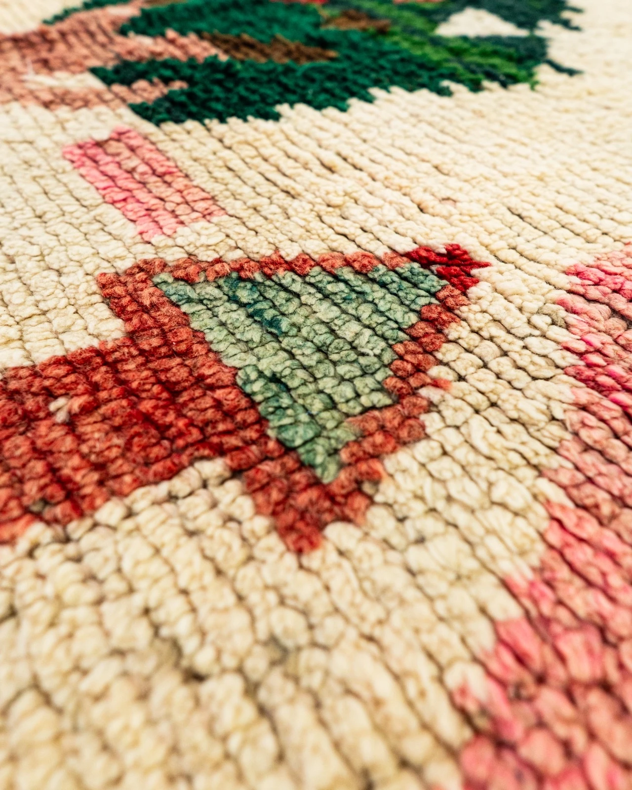Alfombra bereber tejida a mano con lana gruesa, patrones espontáneos y estética bohemia del norte de África.