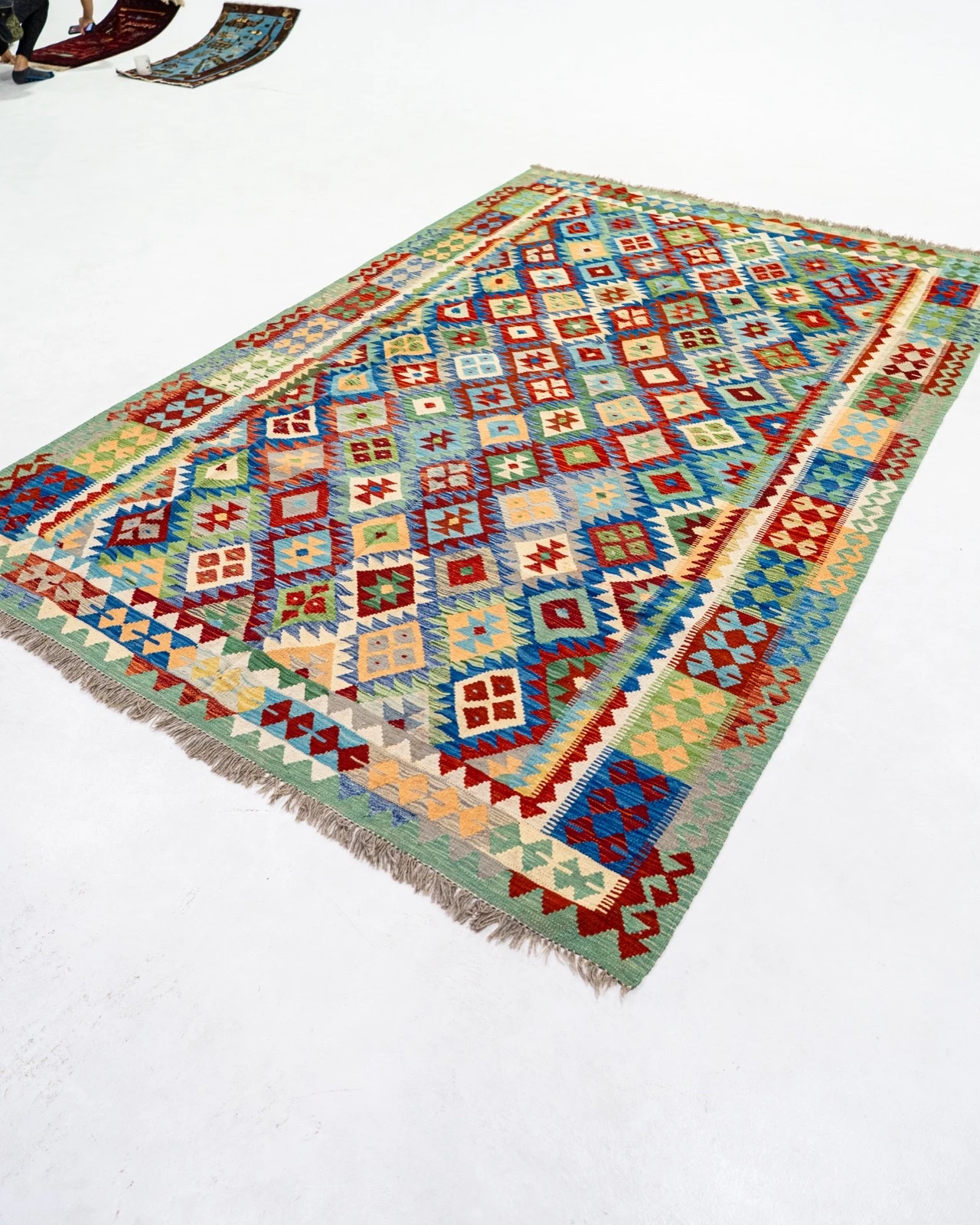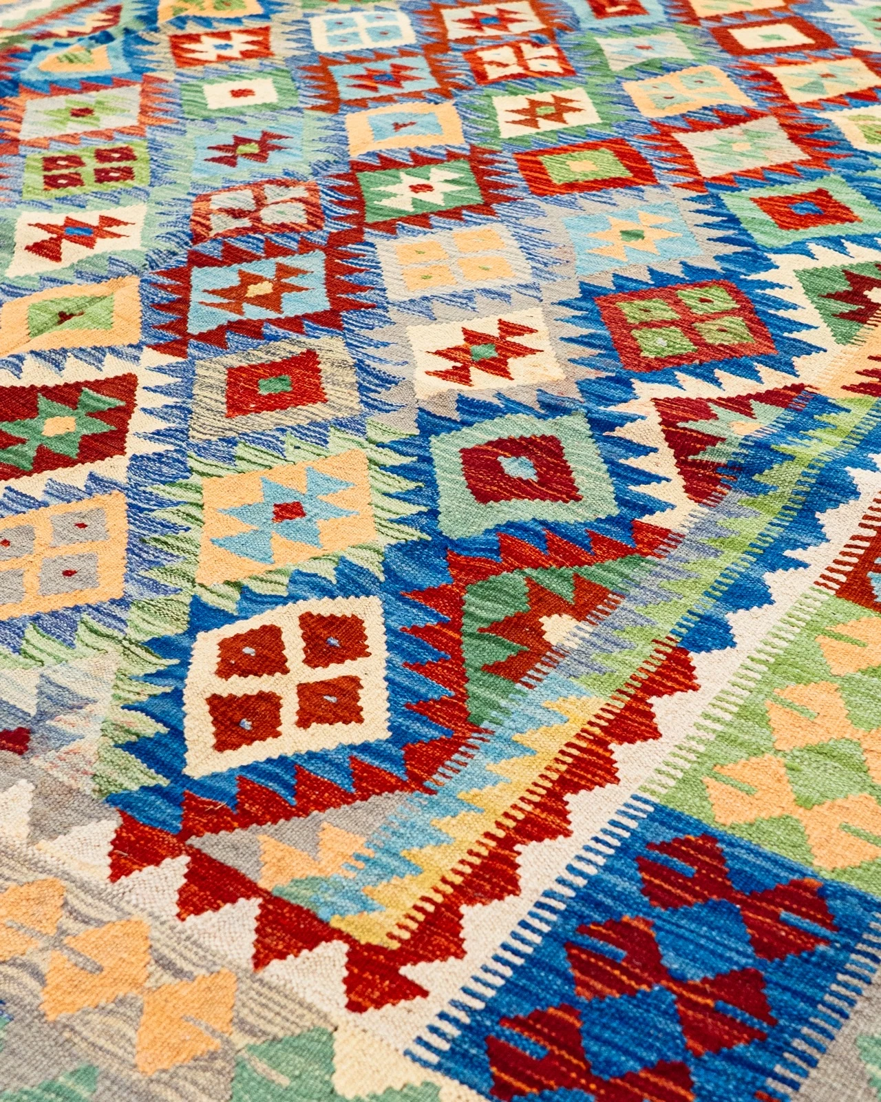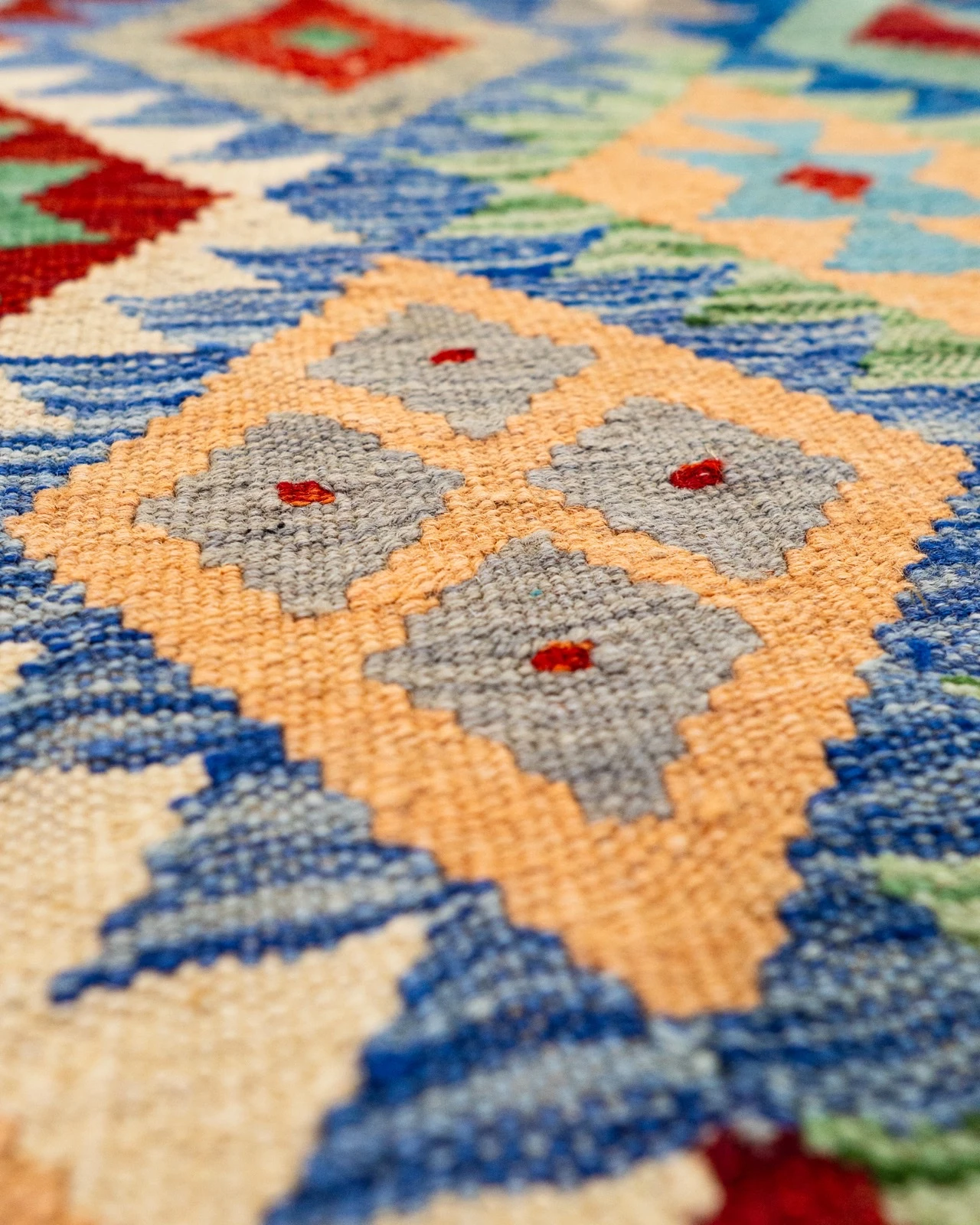 Tejido estrecho ideal para pasillos o entradas, elaborado con técnicas tradicionales de tejido plano.