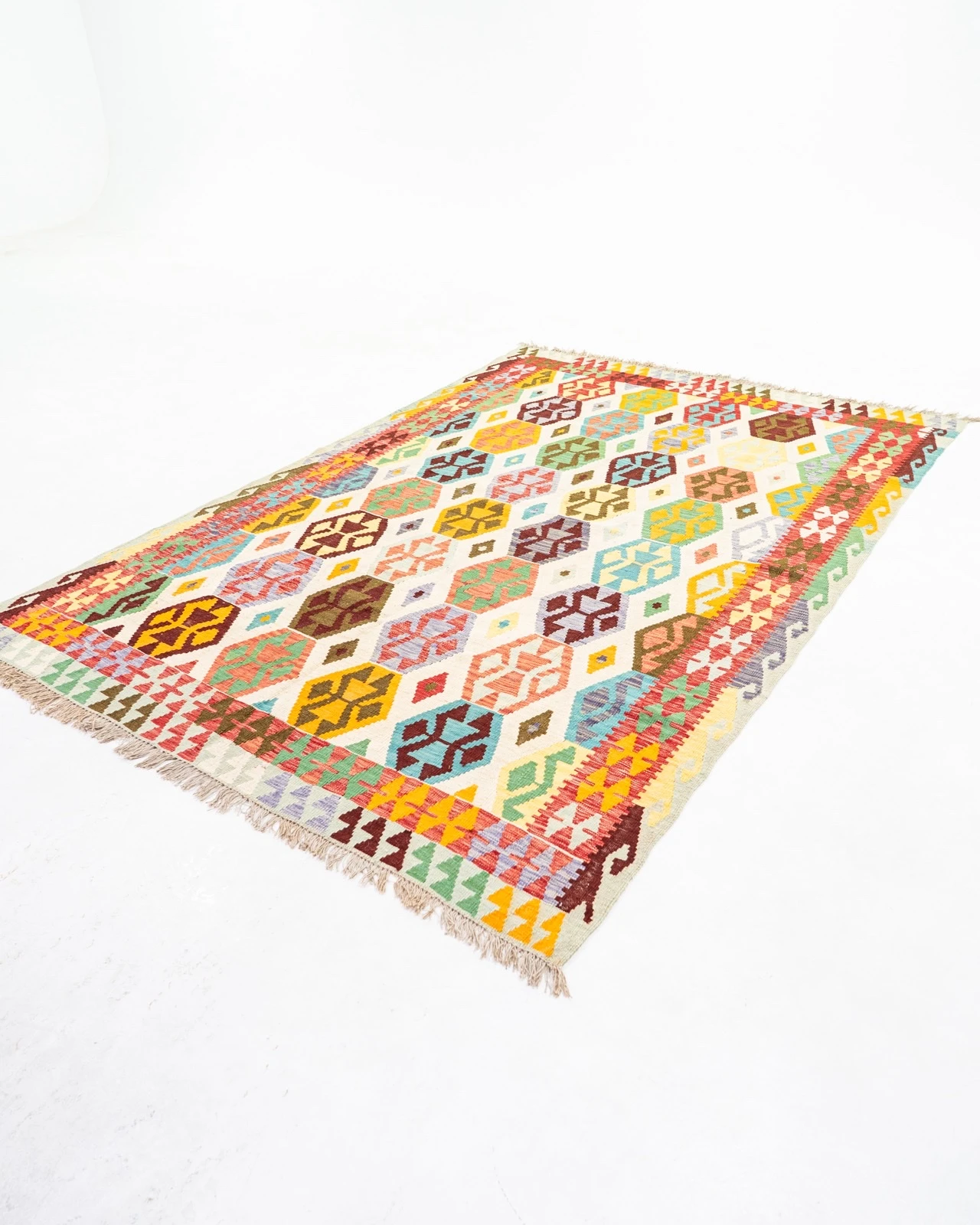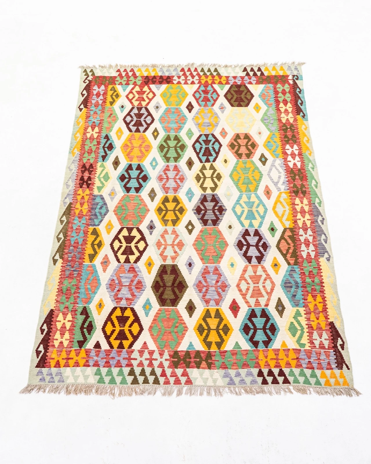 Tejido plano artesanal hecho a mano por comunidades nómadas, conocido por sus patrones geométricos y colores vivos.
