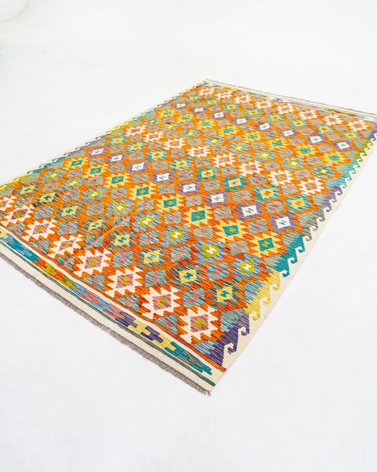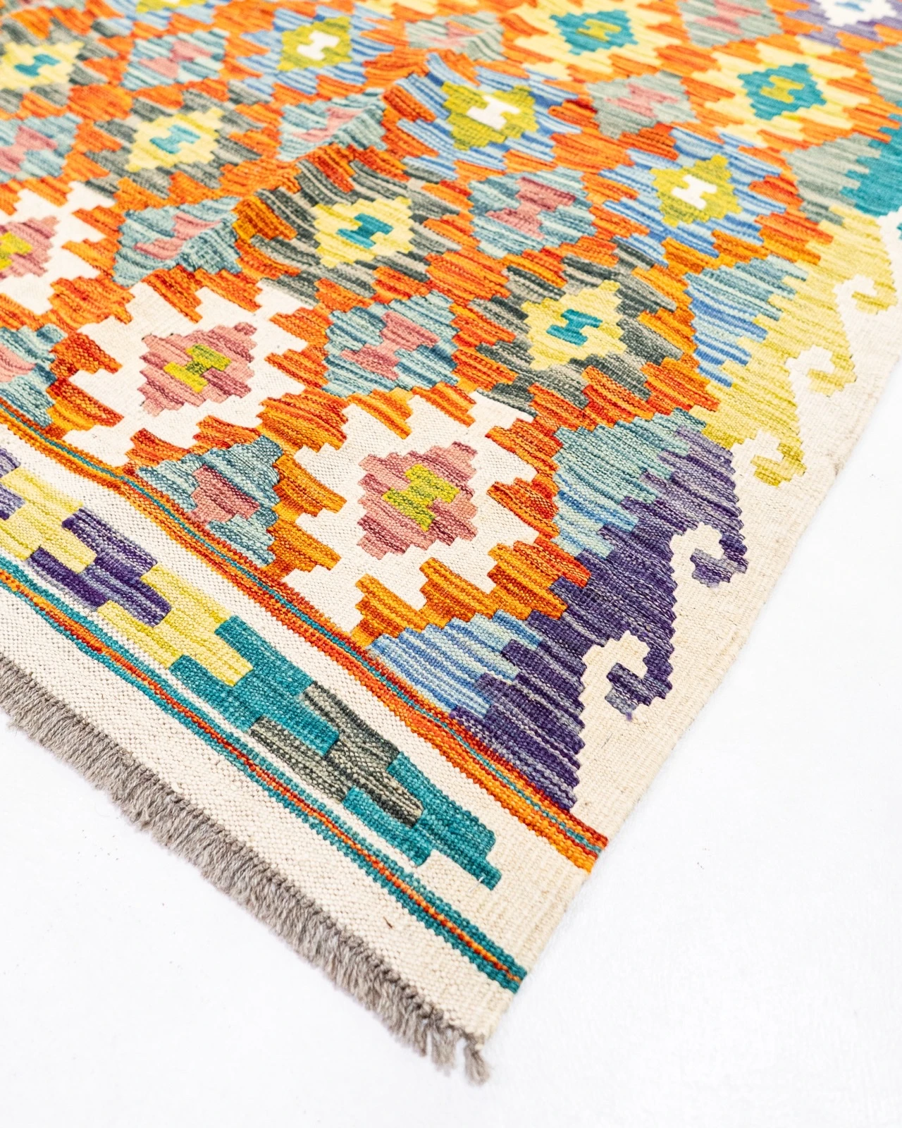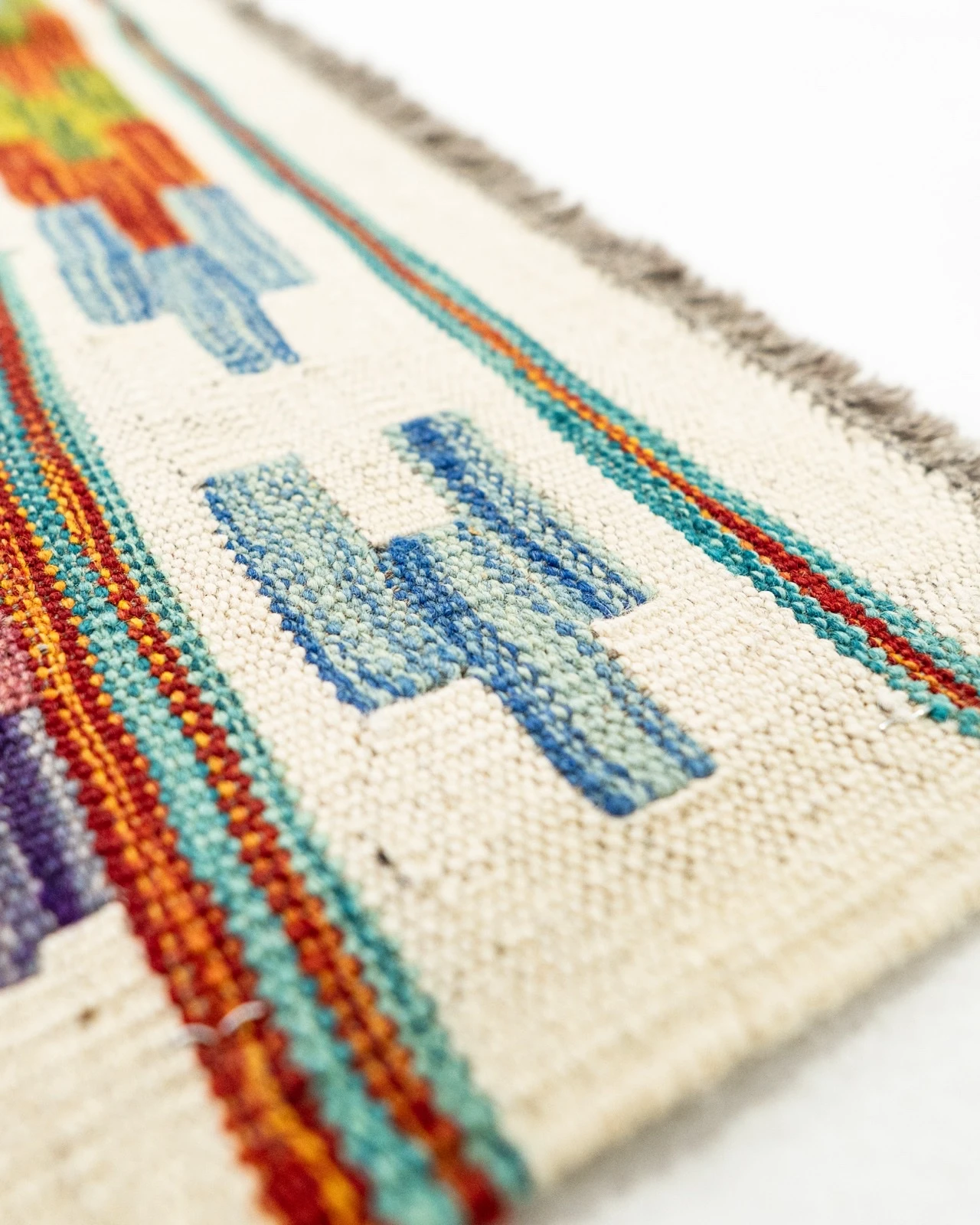 Tejido plano artesanal hecho a mano por comunidades nómadas, conocido por sus patrones geométricos y colores vivos.
