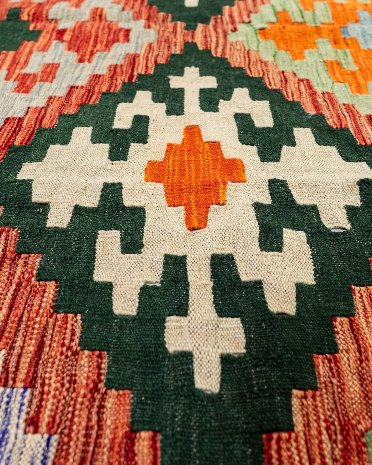 Tejido plano artesanal hecho a mano por comunidades nómadas, conocido por sus patrones geométricos y colores vivos.