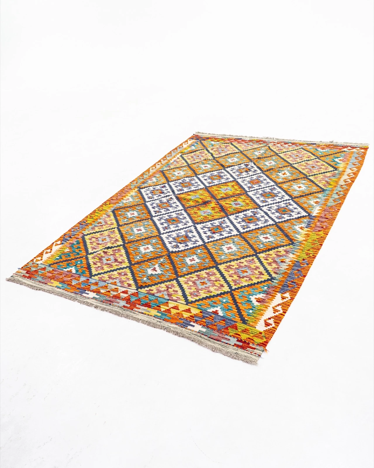 Tejido plano artesanal hecho a mano por comunidades nómadas, conocido por sus patrones geométricos y colores vivos.